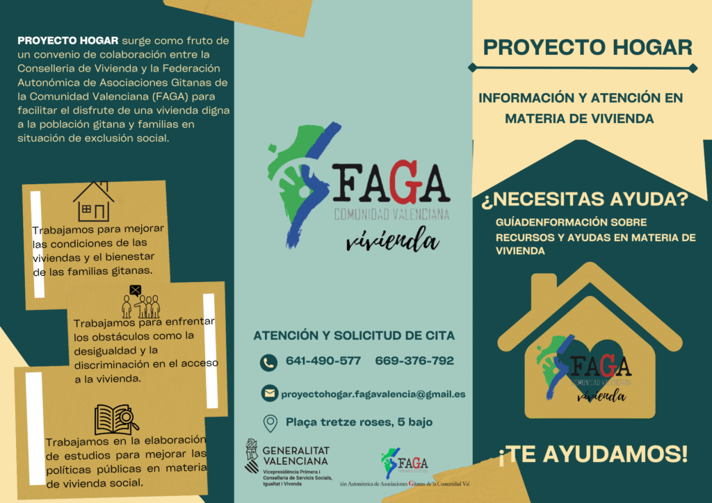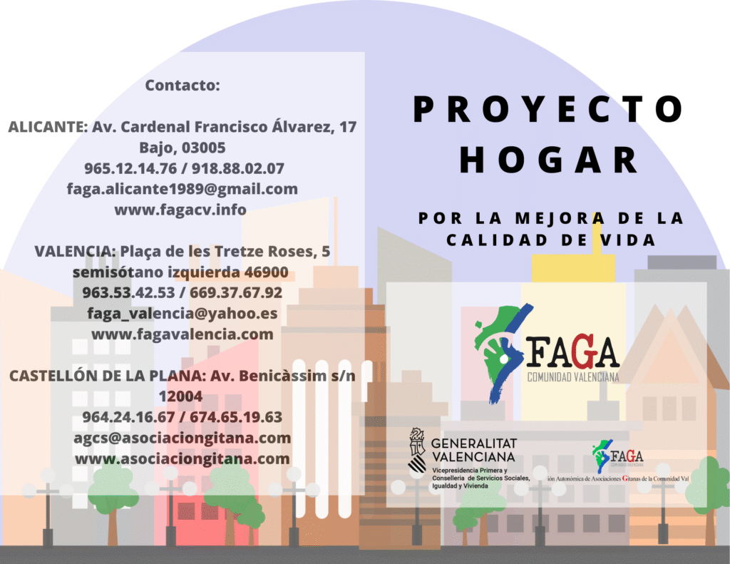 PROYECTO HOGAR surge como fruto de un convenio de colaboración entre la Conselleria de Vivienda y la Federación Autonómica de Asociaciones Gitanas de la Comunidad Valenciana (FAGA) para facilitar el disfrute de una vivienda digna a la población gitana y familias en situación de exclusión social. Los objetivos del convenio son: